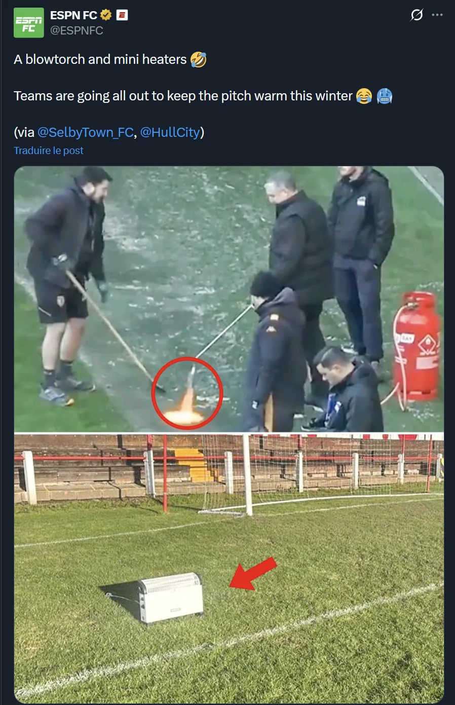Temperatures have been freezing in recent days, in France and elsewhere. The weather is making football difficult, with pitches frozen solid. In England, two clubs tried to find some rather original solutions, using a blowtorch or a heater directly on the pitch!
