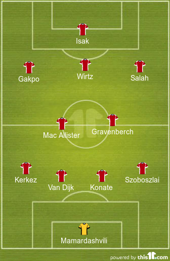 Arne Slot will opt for the 4-2-3-1 formation once again and is expected to name a strong first team for this clash. Mohamed Salah, Alexander Isak and Alexis Mac Allister could all play from the start of this game.