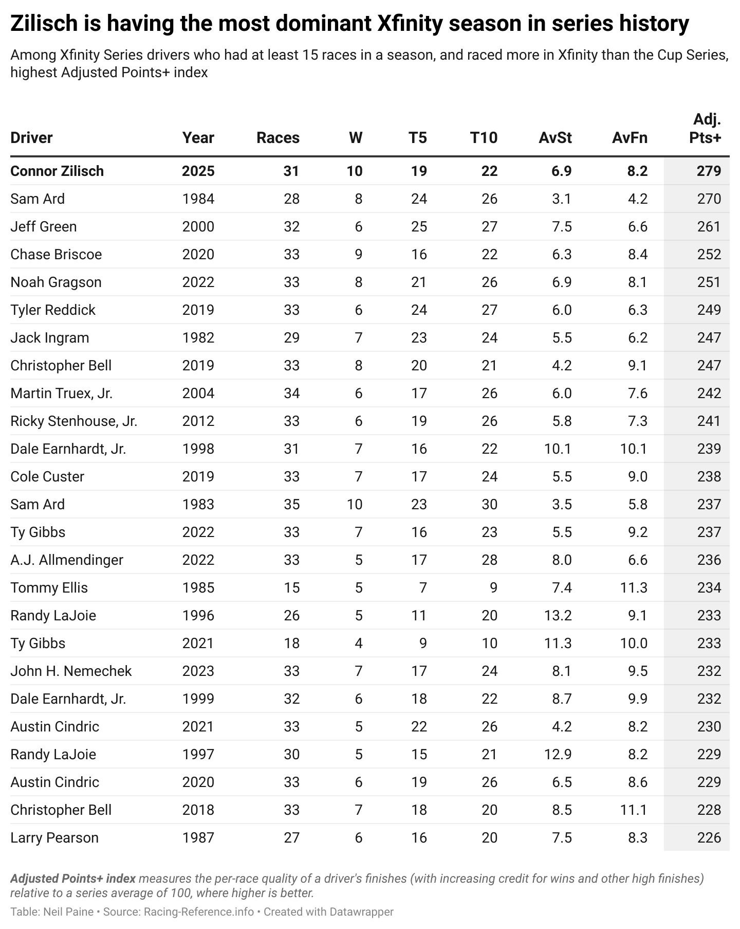 According to the Adjusted Points+ index, which rates the quality of each driver’s per-race finishes (with increasing bonuses for wins and other high placements) relative to a field average of 100, Zilisch — at 279, or 179% better than average — is trying to cap off the most dominant single season by a non-Buschwhacker in the history of the Xfinity Series: