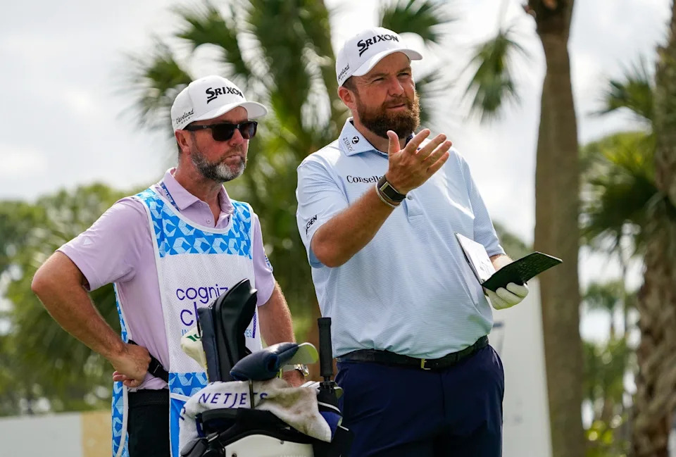 Shane Lowry and his caddie Darren Reynolds discuss his tee shot on the seventh tee during the third round of the Cognizant Classic in the Palm Beaches at PGA National Resort & Spa on Saturday, February 28, 2026, in Palm Beach Gardens, FL.