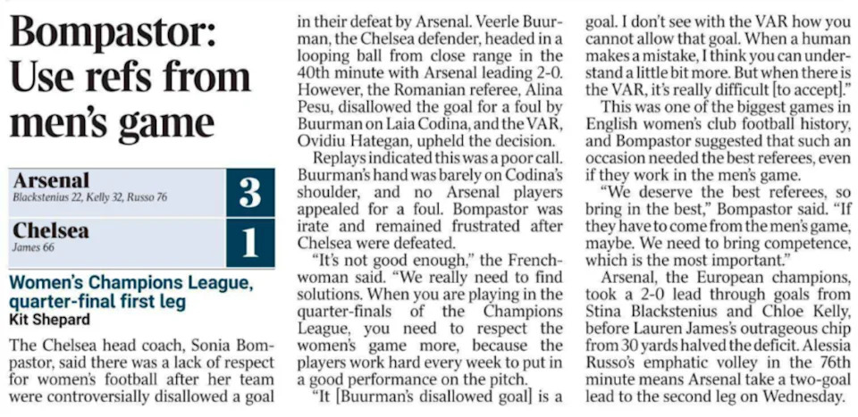 If you pick up today’s papers, most of the coverage of Arsenal’s 3-1 win over Chelsea in the first leg of the Champions League quarter final at the Emirates focuses on Chelsea manager Sonia Bompastor complaining about the VAR call that ruled out her side’s first goal for a very slight touch on an Arsenal defender.