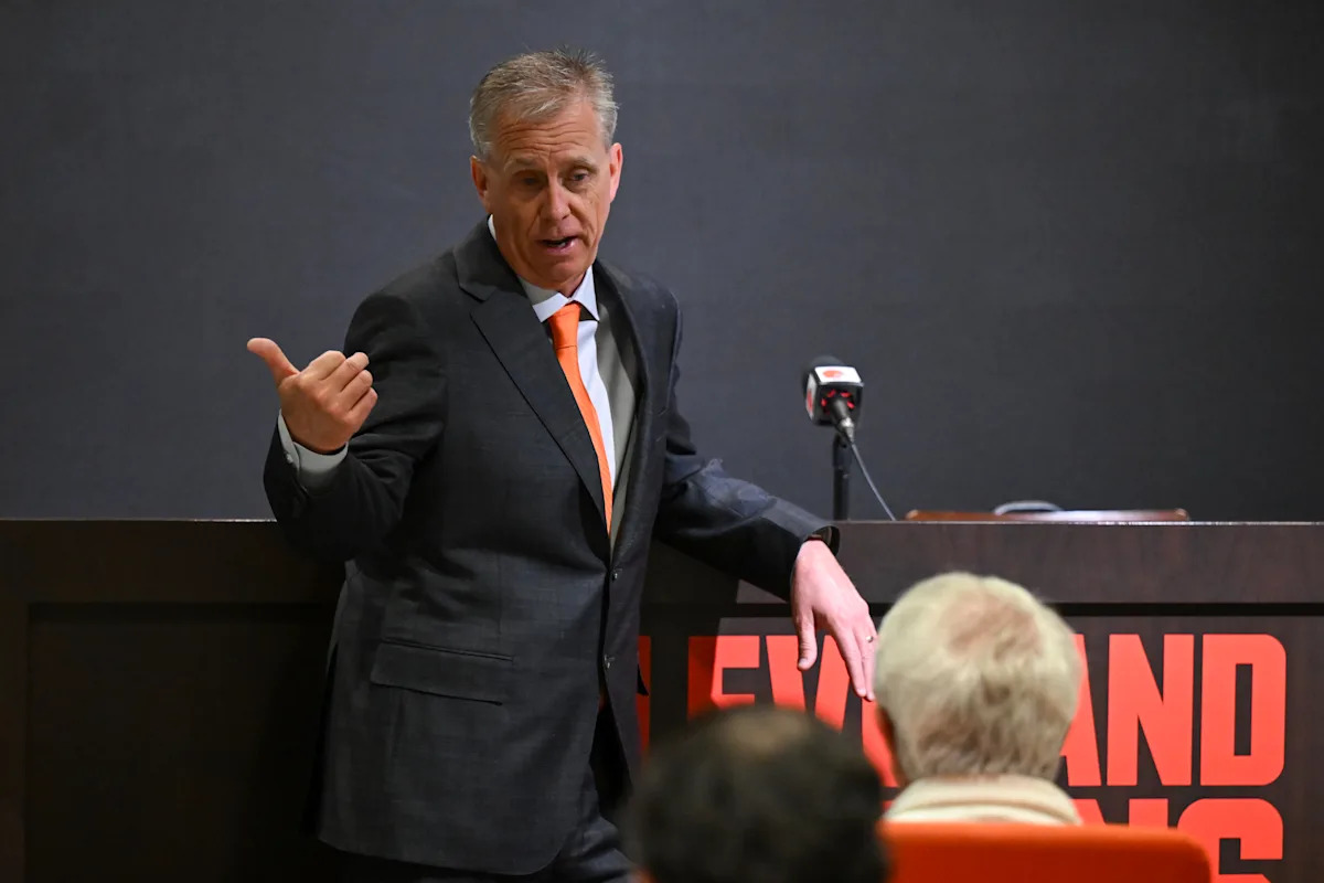 INDIANAPOLIS, IN – FEBRUARY 24: Andrew Berry of the Cleveland Browns speaks during a press conference at the 2026 NFL Scouting Combine on February 24, 2026 in Indianapolis, Indiana. (Photo by Cooper Neill/Getty Images) | Getty Images