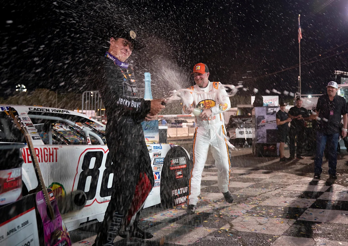 Dale Earnhardt Jr. talks with driver Chad McCumbee after qualifying in his #8 Chevy at Nashville Fairgrounds Speedway Nashville, Tenn., Saturday, April 11, 2026.