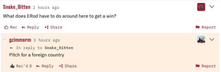 The Gameday Thread saw some more inevitable falloff from the first two games, in part I suspect because the University of Arizona was punching their ticket to the NCAA March Madness Final Four (BEAR DOWN!), and also because, well, it’s really not a lot of fun to watch the Billionaire Boys Club play baseball on television if you’re not particularly a fan of billionaires. That said, we racked up 182 comments at time of writing. Comment of the game goes by popular acclaim to this one from gzimmerm, who saw the meatball that Snake_Bitten left in the middle of the plate, and didn’t miss it: