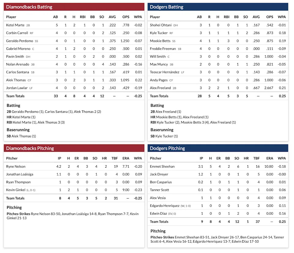 Ryne Nelson couldn’t quite match Emmet Sheehan’s 3 strikeouts in the first inning, but he buckled both Shohei and Tucker with beautiful knee-high sliders to ꓘ them starting off the game. Mookie put the first ball in play of the whole game with a soft lineout to Corbin in right.