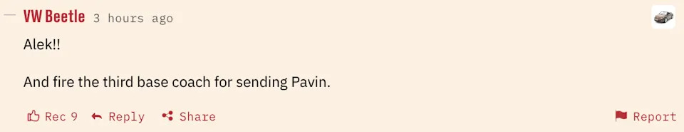 It wasn’t Opening Night levels, but the GDT was still well populated, finishing at 267 comments at time of publishing. Many went Sedona Red, but first COTG for the season goes to VW Beetle with a game-leading number of Recs with his reaction to Alek’s hit and the base coach assisted TOOTBLAN in the second inning: