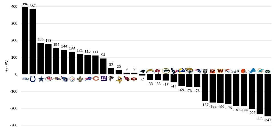 In a true twist-the-knife scenario, it’s (of course) the Jets who come in at the bottom of the heap, a cool -247. Obviously, the Darnold/Colts trade is a big part of that, but the Jets scored at least a -60 three times (2017, 2018 and 2020) and never had a score better than +21.
