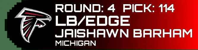 The Falcons manage to get their original fourth-rounder back from the Eagles, and immediately put it to good use addressing one of their biggest needs. With Kaden Elliss departing in free agency, Atlanta has a hole at both linebacker and pass rusher. Thankfully, there’s a potential Elliss replacement in this draft class, and his name is Jaishawn Barham. Barham played two seasons at off-ball linebacker before switching to a stand-up edge rusher role at Michigan in 2025, and the results were impressive.