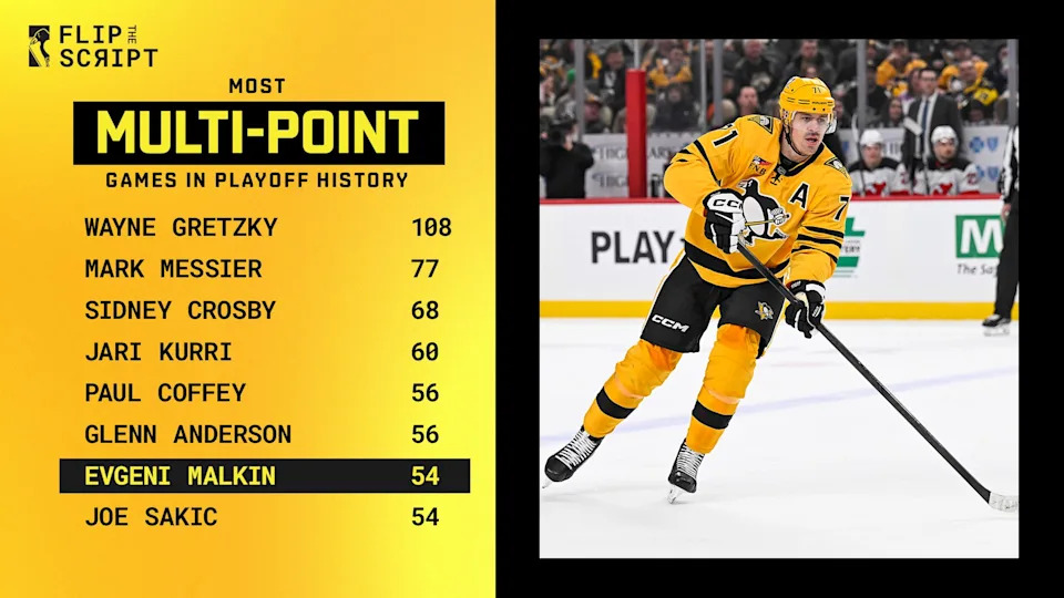 Evgeni Malkin had a two-point night in Game 1 to tie Joe Sakic for seventh all-time in NHL playoff history multi-point games. Sidney Crosby still sits solidly in third place after his multi-point last outing in Game 3.