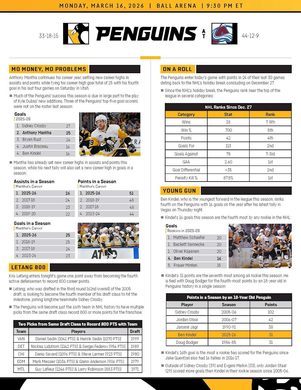Who: Pittsburgh Penguins (33-18-15, 81 points, 2nd place Metropolitan Division) @ Colorado Avalanche (44-12-9, 97 points, 1st place Central Division)