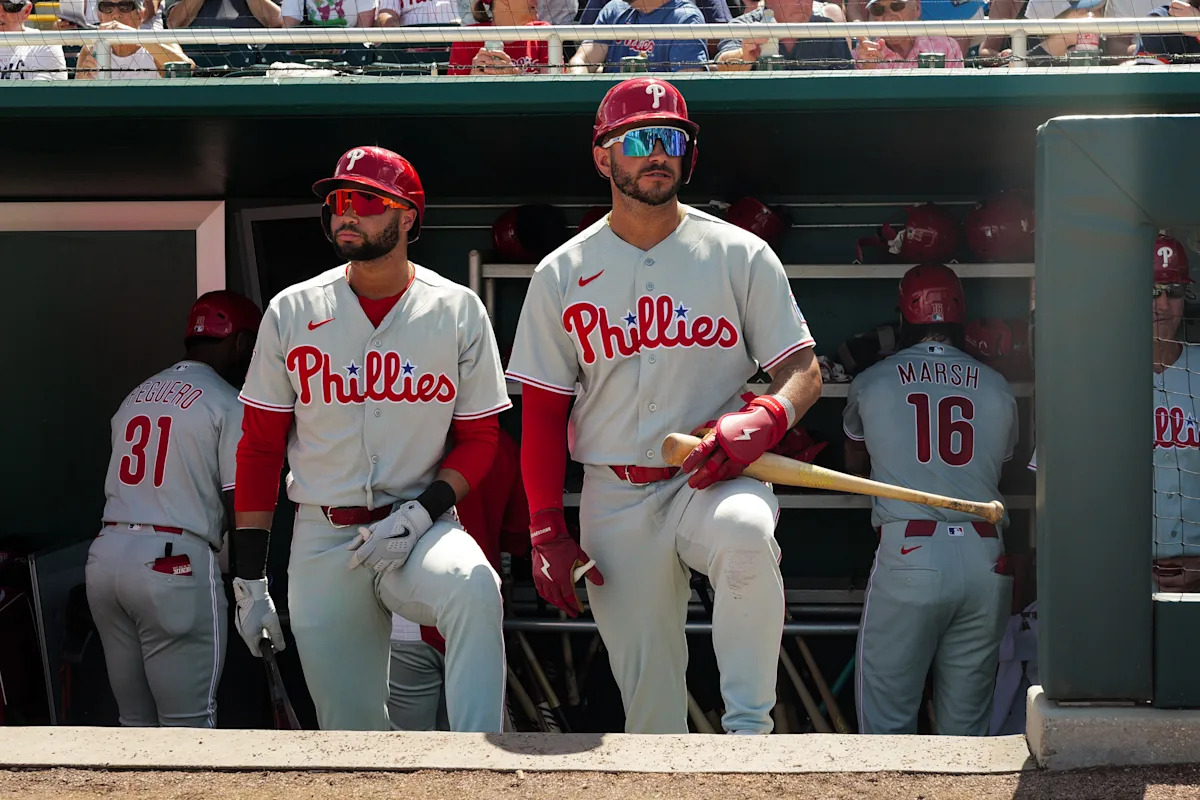 FORT MYERS, FL – MARCH 08: Justin Crawford #80 and Otto Kemp #4 of the Philadelphia Phillies look on from the dugout prior to the game between the Philadelphia Phillies and the Minnesota Twins at CenturyLink Sports Complex on Sunday, March 8, 2026 in Fort Myers, Florida. (Photo by Michael Mooney/MLB Photos via Getty Images) | MLB Photos via Getty Images