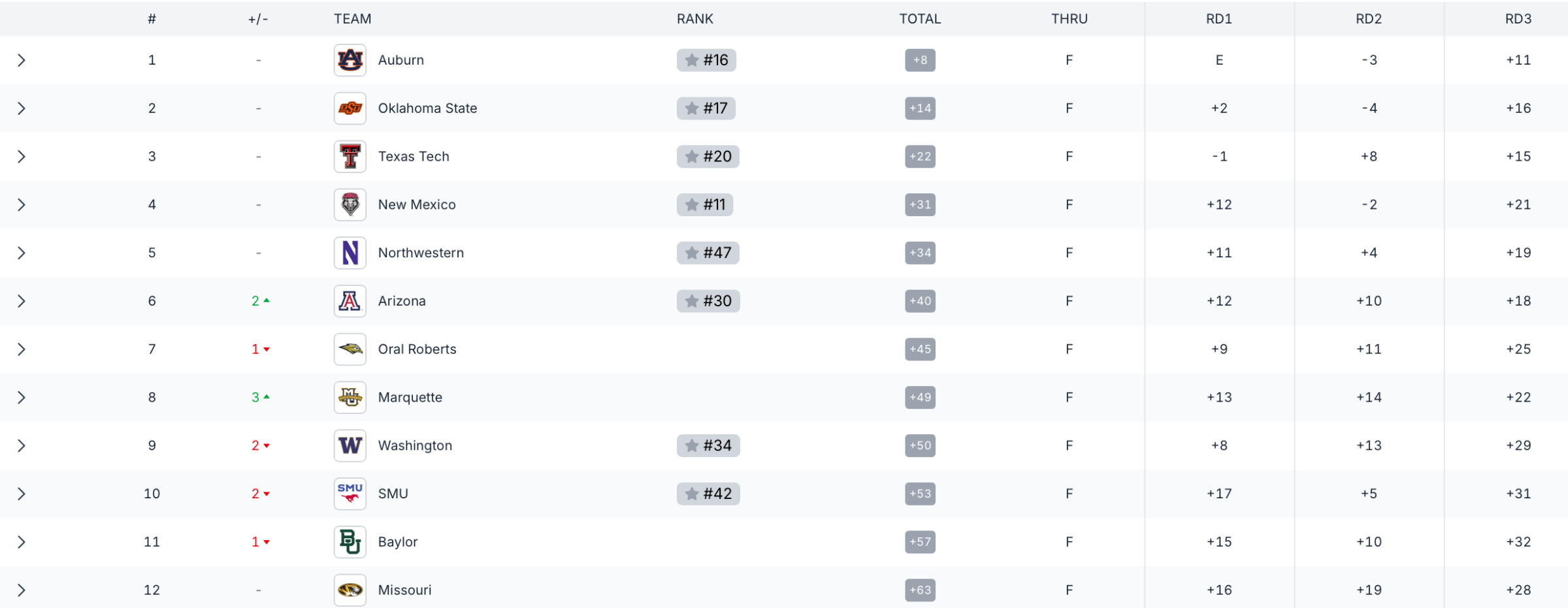 On day one, Northwestern got off to a slow start with an 11-over-par round. The team sat in sixth place, 14 shots behind Auburn. No NU player finished under par, but Rowan Sullivan and Daniel Svärd continued to pace the team with scores of 1-over and 2-over, respectively. The Wildcats remained in contention but needed improvement to climb the leaderboard.