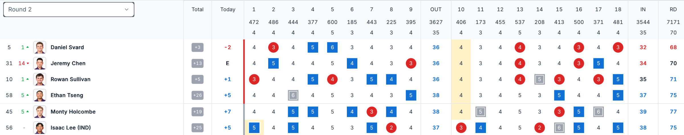 In the second round, NU made progress with a 4-over team score. Svärd turned in a strong performance with a 2-under 68, moving him into solo sixth after two rounds. Jeremy Chen added a steady even-par round that included three birdies. Northwestern ended the day in fifth place with an opportunity to continue moving up the standings in the final round.