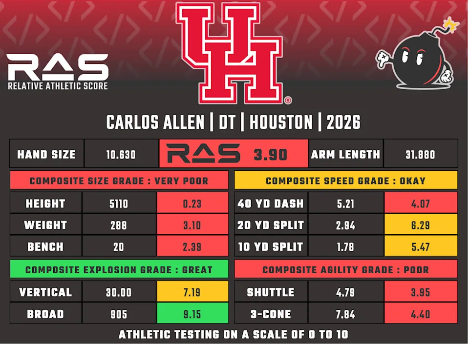 Allen was the heart and soul of Houston’s defense over the past two years. What he lacked in size, he more than made up with his play, generating 80 tackles to lead all FBS defensive tackles in 2025. Allen also contributed 7.5 tackles for loss and 1.5 sacks, serving as an omnipresent force on the defensive line. At Pro Day, Allen stood out with a 9-foot-5-inch broad jump, showcasing his athleticism that was evident on the field.