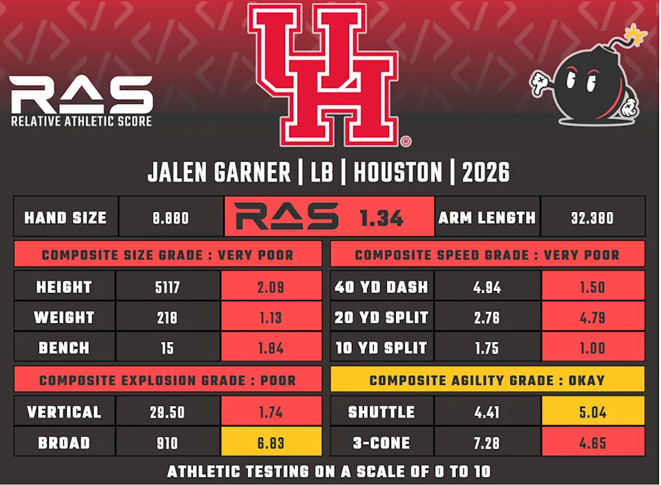 Garner was arguably Houston’s most improved player from 2024 to 2025, rising from a backup linebacker to a 10-3 team’s second-leading tackler with 77 takedowns. Garner added two sacks, 3.5 tackles for loss, and a pair of forced fumbles to a loaded résumé, one he hopes can be conveyed into an NFL future. At Pro Day, the shuttle run and broad jump were his top testing categories.
