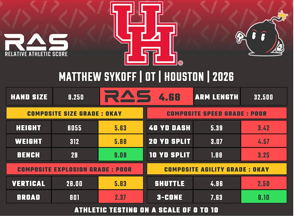 Wykoff was a well-traveled lineman, playing two years at Texas A&M (2021-22), another two at California (2023-24), and one final season at Houston. More importantly, he accrued valuable starting experience at all three stops, playing snaps at center, guard, and tackle. Guard was his primary position where he started 11 games for the Cougars in 2025, refusing to allow a single quarterback hit or sack all season. Wykoff particularly excelled on the bench press and in the 3-cone drill at Pro Day.