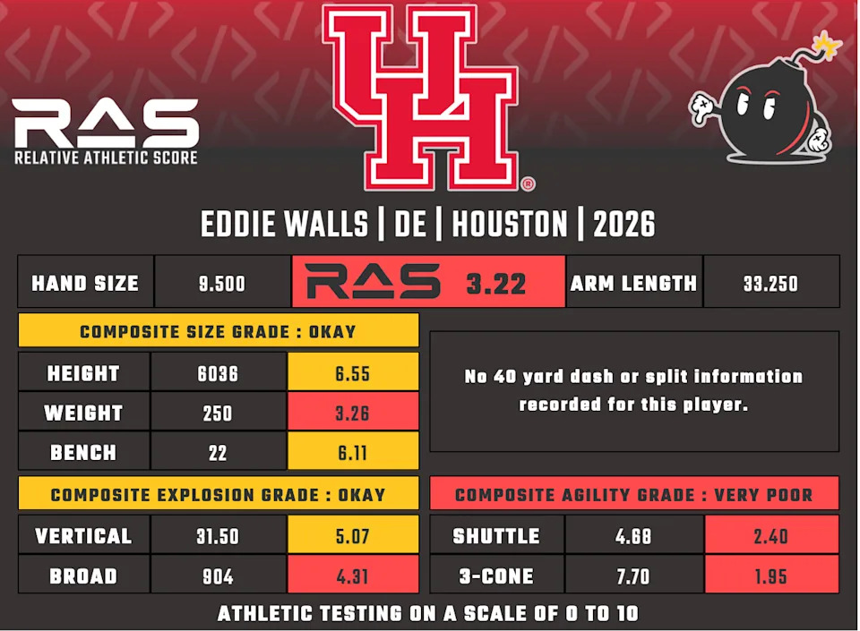 Walls originated at the FCS level, spending the 2021-23 seasons at Bethune-Cookman. In 2024, he shined at the FBS level with FIU, immediately leading the team in sacks with 5.0. That same dominance up front translated to Houston where he ranked atop the Cougars with 7.0 sacks and 11.5 tackles for loss, putting his fingerprints all over the season-ending Texas Bowl win over LSU.