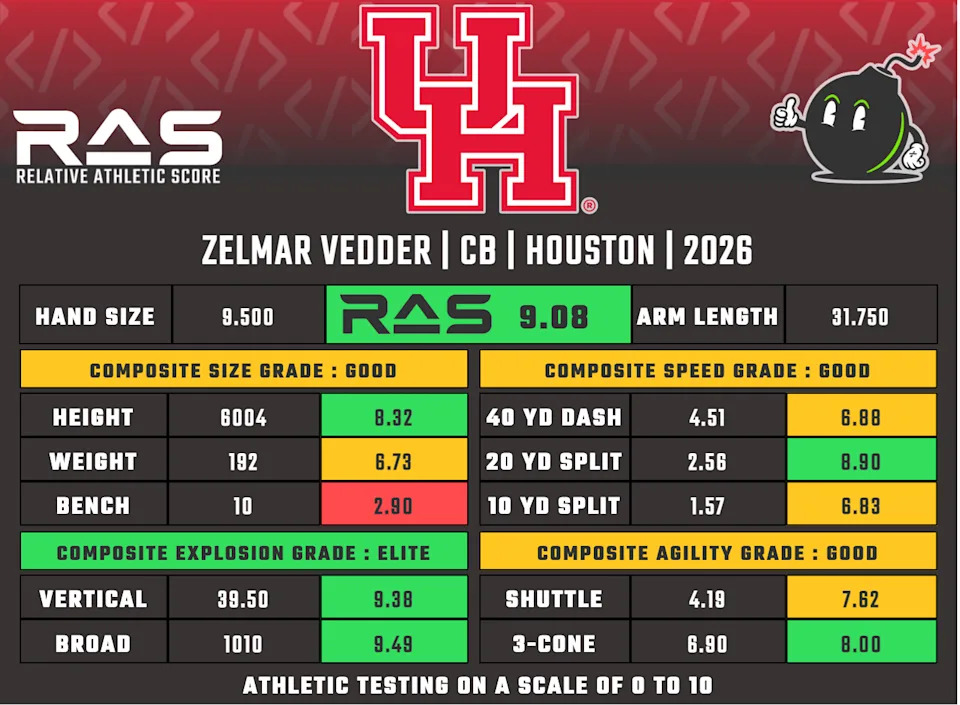 Vedder traveled from the JUCO ranks to Sacramento State (while it was an FCS school) to Houston in an eventful college career. He wasted no time in contributing to the Cougars’ secondary in 2025, finishing with 20 tackles and seven pass breakups — ranking third on the team in the latter statistic. Vedder enjoyed one of the best Pro Days of any Cougar, drawing eyeballs in the vertical and broad jumps, while recording a solid 4.51-second 40-yard dash time.