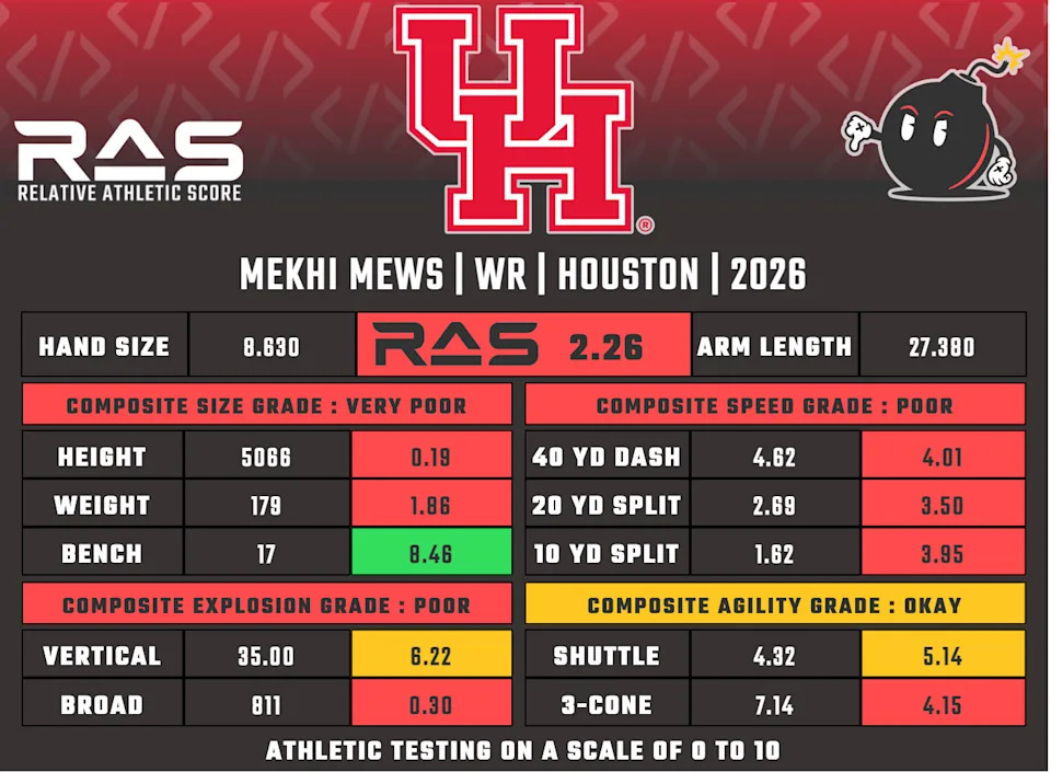 Mews is a two-time national champion, serving as a member of the 2021 and 2022 Georgia Bulldogs teams that ran through the College Football Playoff. He saw expanded playing time in 2023 at Georgia before transferring to Houston. In 2024, he attained career-highs in receptions (29) and receiving yards (253), while housing his second punt return touchdown of his college career. Mews remained the Cougars’ primary punt returner in 2025 which could be his ideal role at the next level.