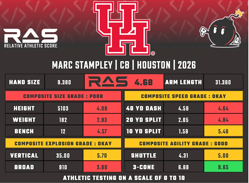 Stampley was one of many transfers in Houston’s 2025 secondary — perhaps the deepest unit on the roster. The former Georgia Southern Eagle was a ballhawk throughout his college career, securing seven interceptions including two at Houston. Stampley added 28 tackles and a pair of pass breakups last season while starting seven games at the ‘star’ position. He tested exceptionally at the 3-cone drill on Pro Day.