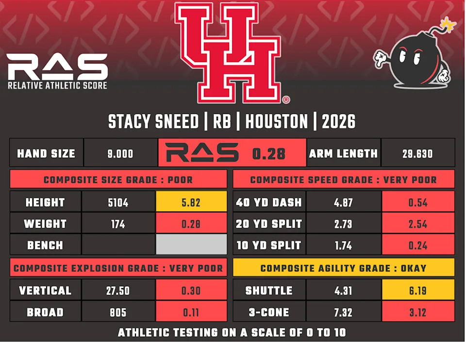 Sneed was tied for the longest tenured member of the Houston roster, first arriving to campus for the 2020 pandemic-adjusted season. Even through the coaching change from Dana Holgorsen to Willie Fritz, Sneed stuck with the Cougars, often operating as a second fiddle in the backfield. He averaged 5.5 yards per carry across his college career, with the majority of his production stemming from the 2022 campaign. Sneed’s best relative score at Pro Day transpired in the shuttle run.