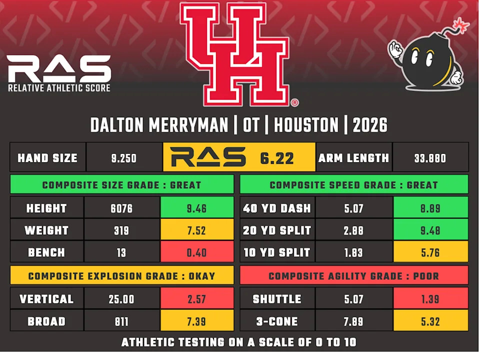 Perhaps Houston’s biggest positional upgrade from the 2024 team that went 4-8 to last year’s 10-3 squad was the offensive line. The Cougars brought in size, and the 6’8” Merryman certainly fortified the trenches. The starting right tackle never allowed multiple sacks in a single game and presented impressive speed for his size. That was evident at Pro Day with a 5.07-second 40-yard dash and a 7.89-second 3-cone drill.