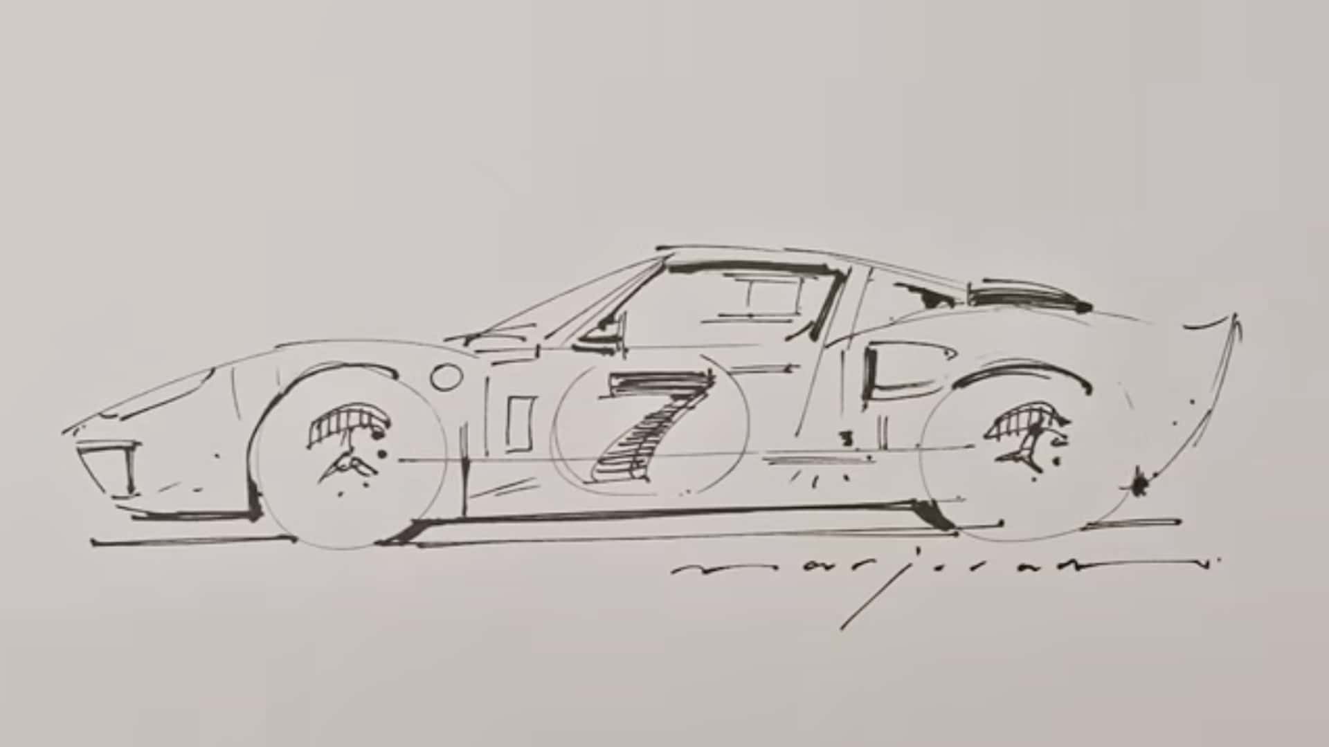 From there, Marjoram quickly begins to develop the rest of the vehicle with his pen. The Ford GT40 starts to take shape courtesy of its front and rear fender lines. Next comes the low roof, and the iconic silhouette appears before you.