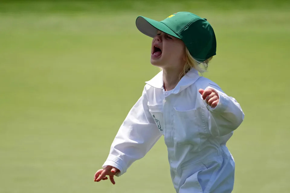 Millie Holtz, daughter of Brandon Holtz, reacts on the fourth green during the Par 3 Contest at the Masters Tournament at Augusta National Golf Club.