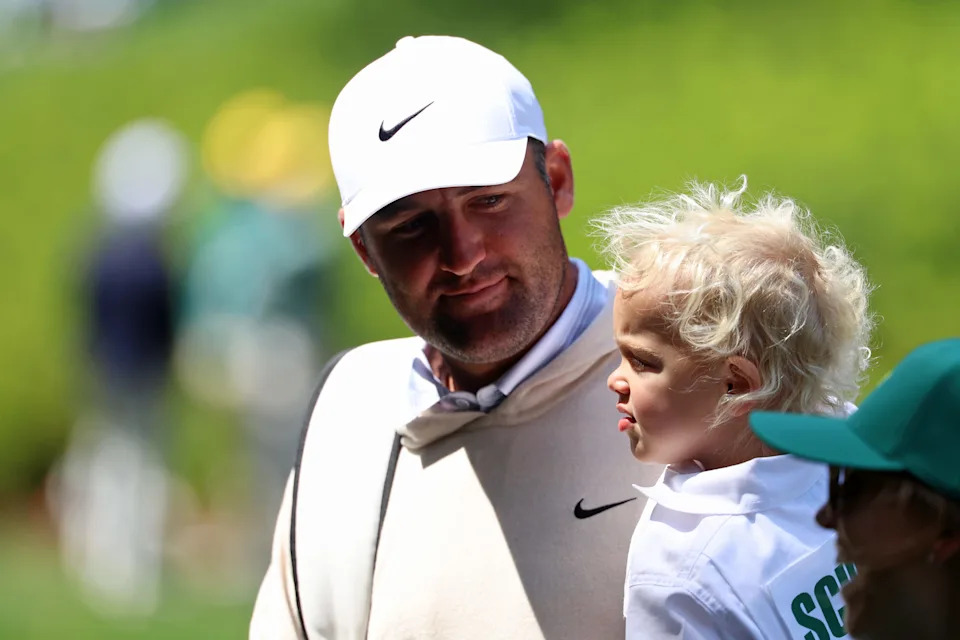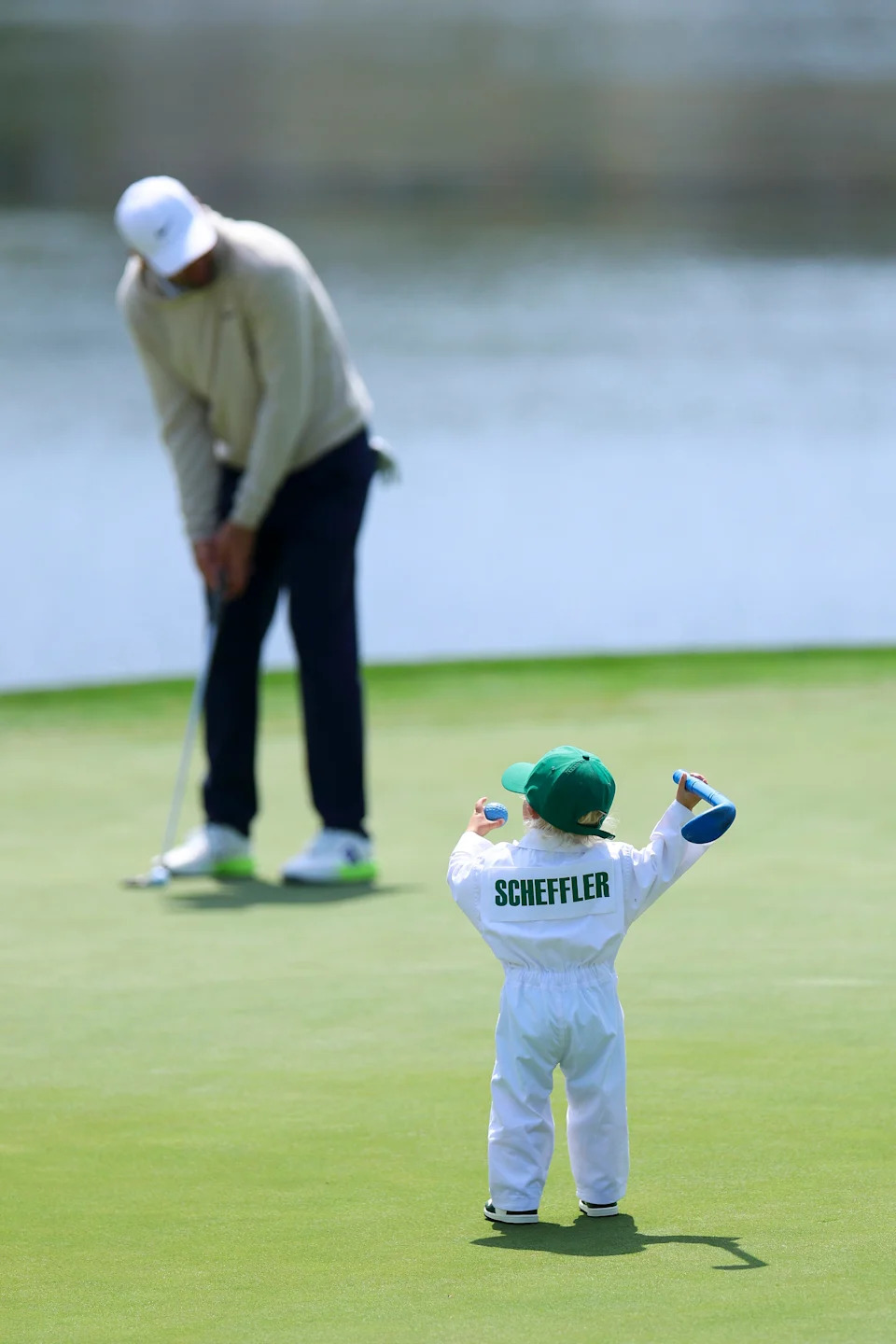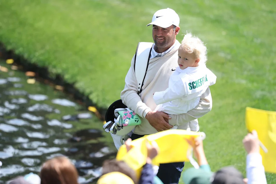 Scottie Scheffler and his son Bennett on the eighth green during the Par 3 Contest at the Masters Tournament at Augusta National Golf Club.