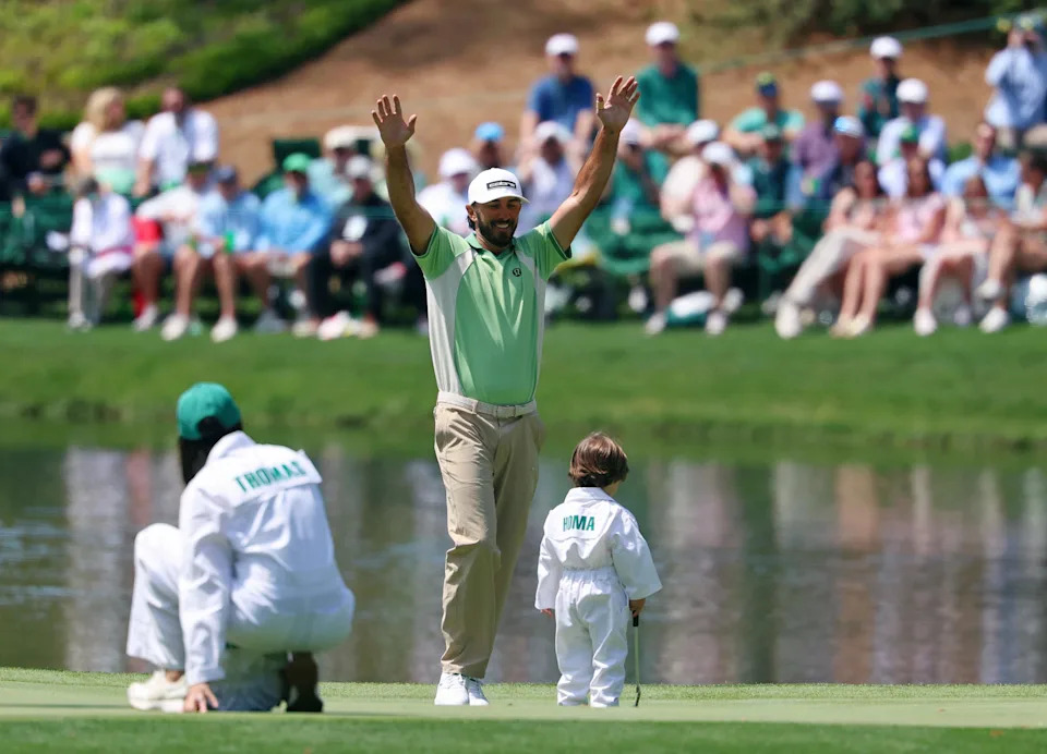 Max Homa reacts after his son Cam made a putt on the eighth green during the Par 3 Contest at the Masters Tournament at Augusta National Golf Club.