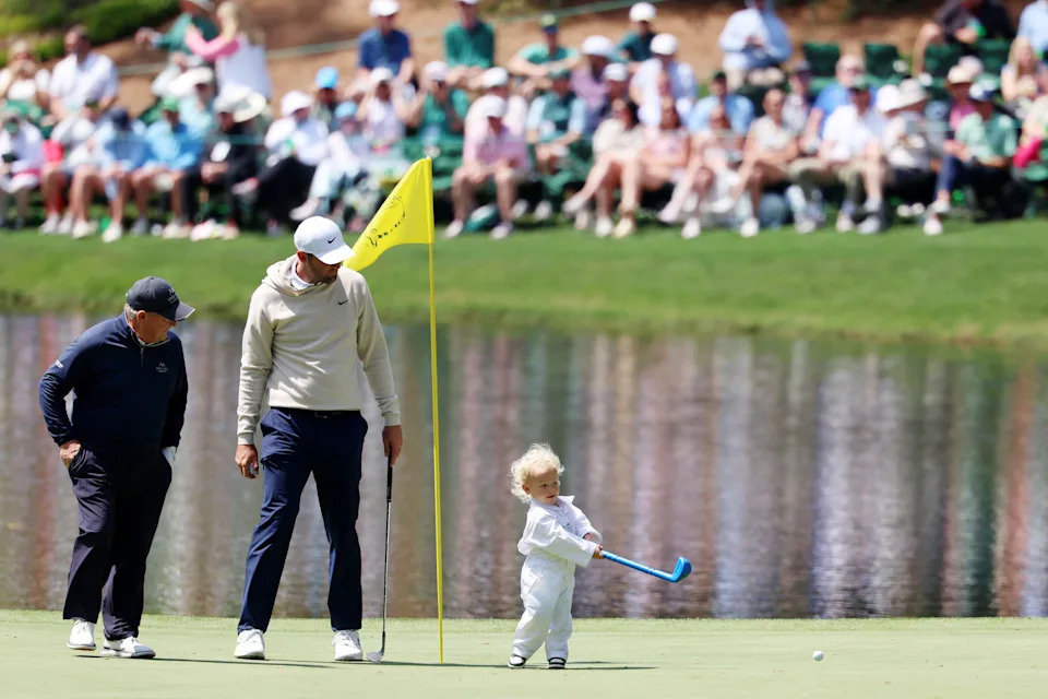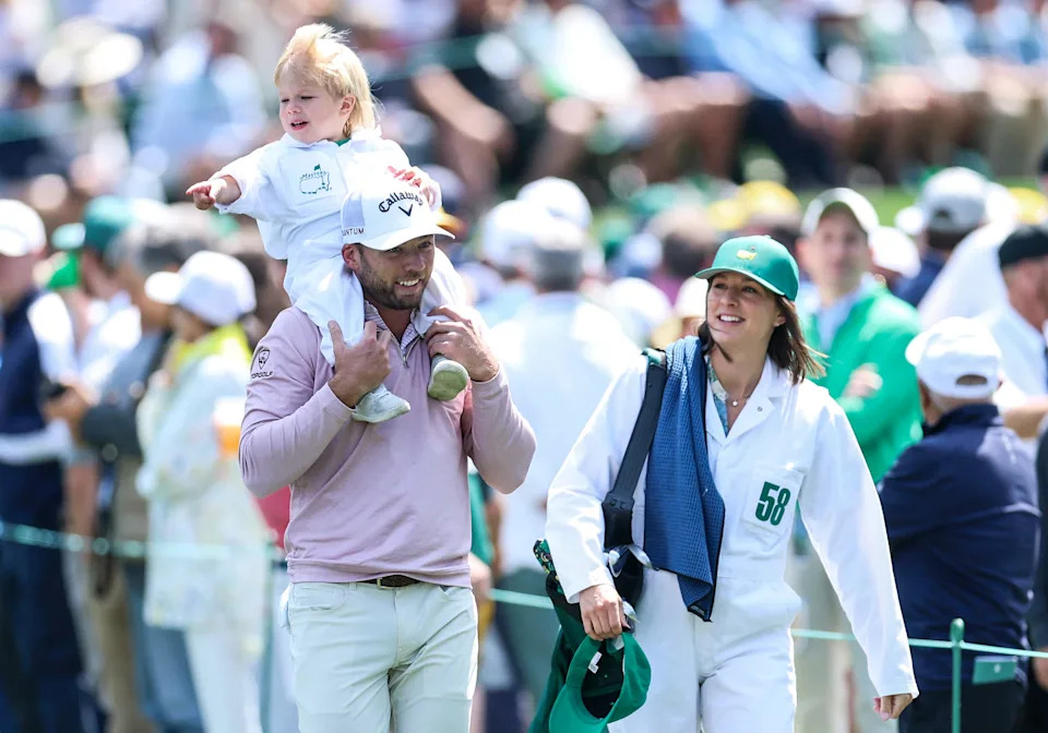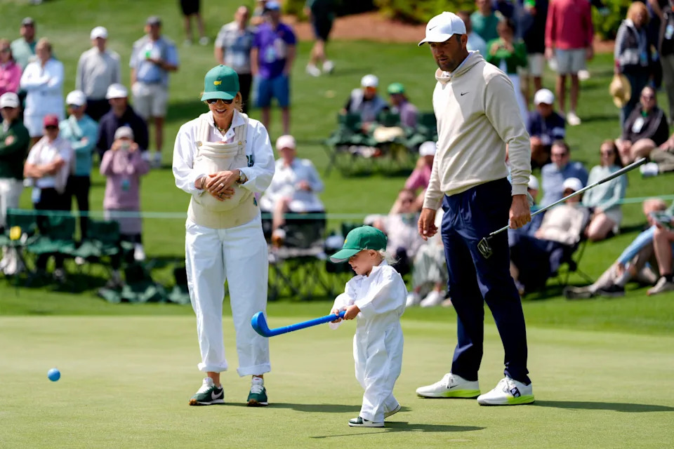 Scottie Scheffler and his wife, Meredith, watch as their son, Bennett, putts on the second green during the Par 3 Contest at the Masters Tournament at Augusta National Golf Club. With Meredith is their son Remy.