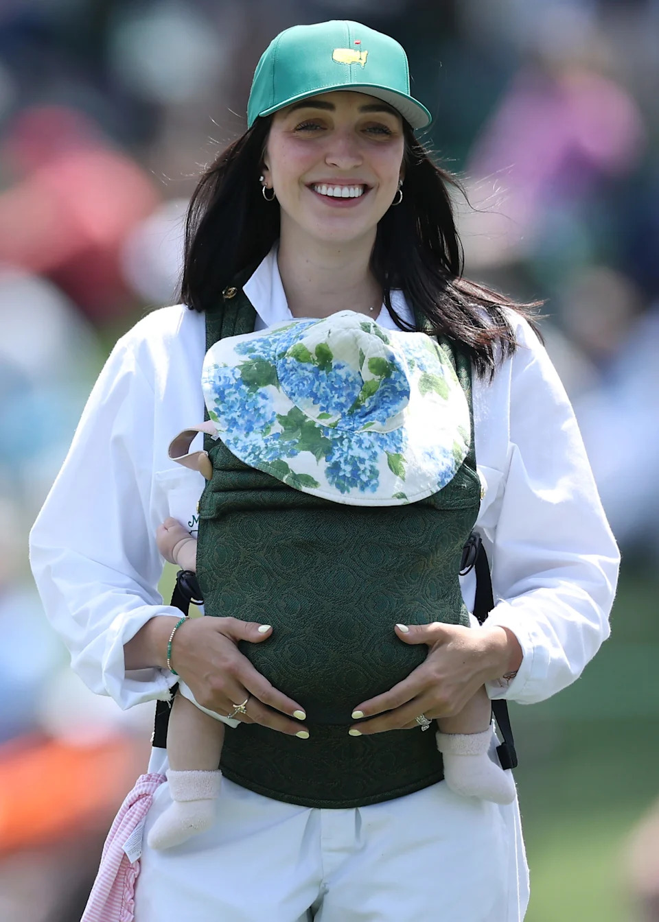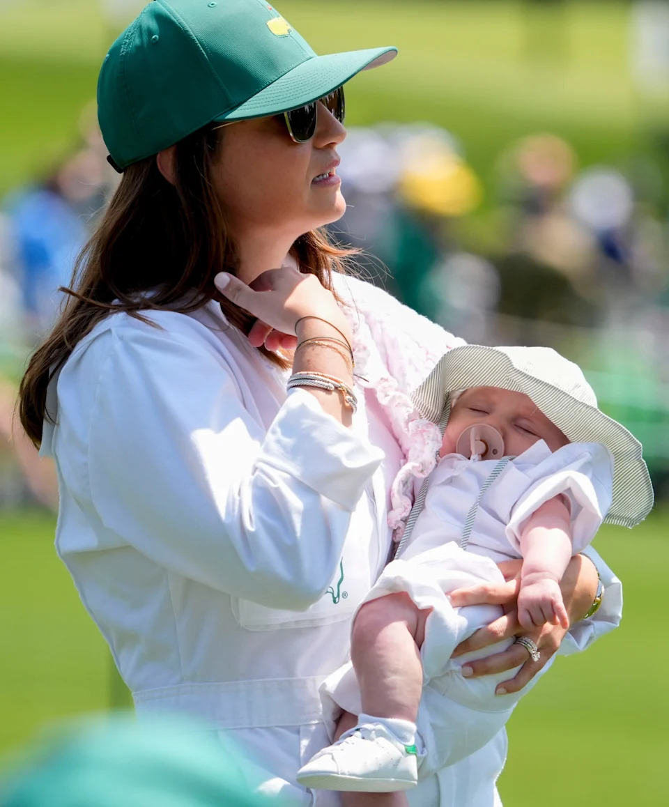 Maya McNealy, wife of Maverick McNealy (not pictured) of the United States, holds their daughter Adeline during the Par Three Contest prior to the 2026 Masters Tournament at Augusta National Golf Club on April 08, 2026 in Augusta, Georgia.