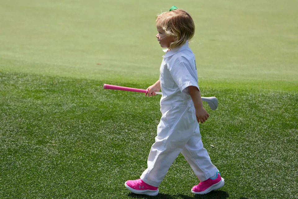 Sophie Spieth, daughter of Jordan Spieth, walks on the fourth hole during the Par 3 Contest at the Masters Tournament at Augusta National Golf Club.