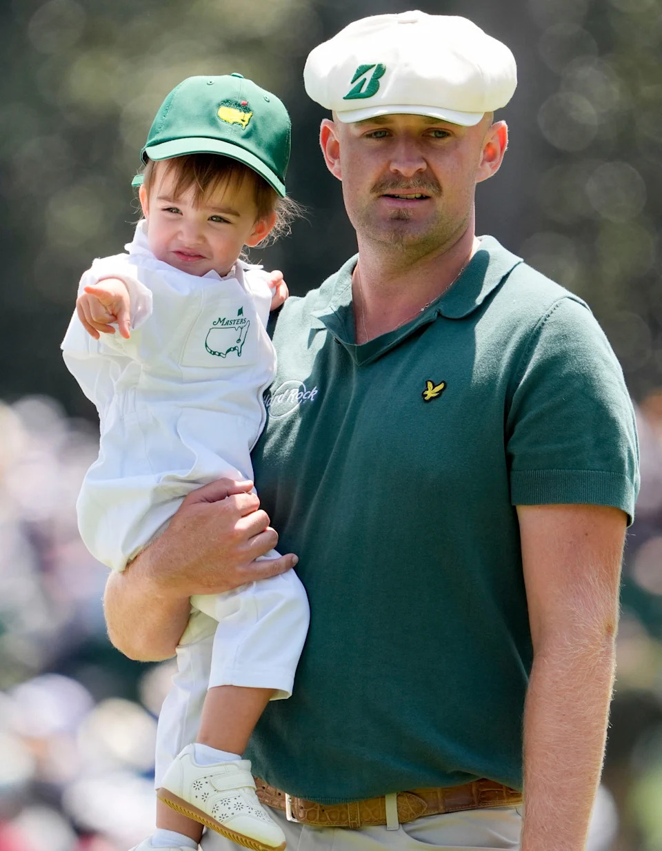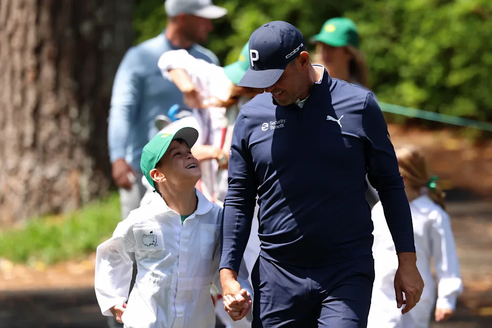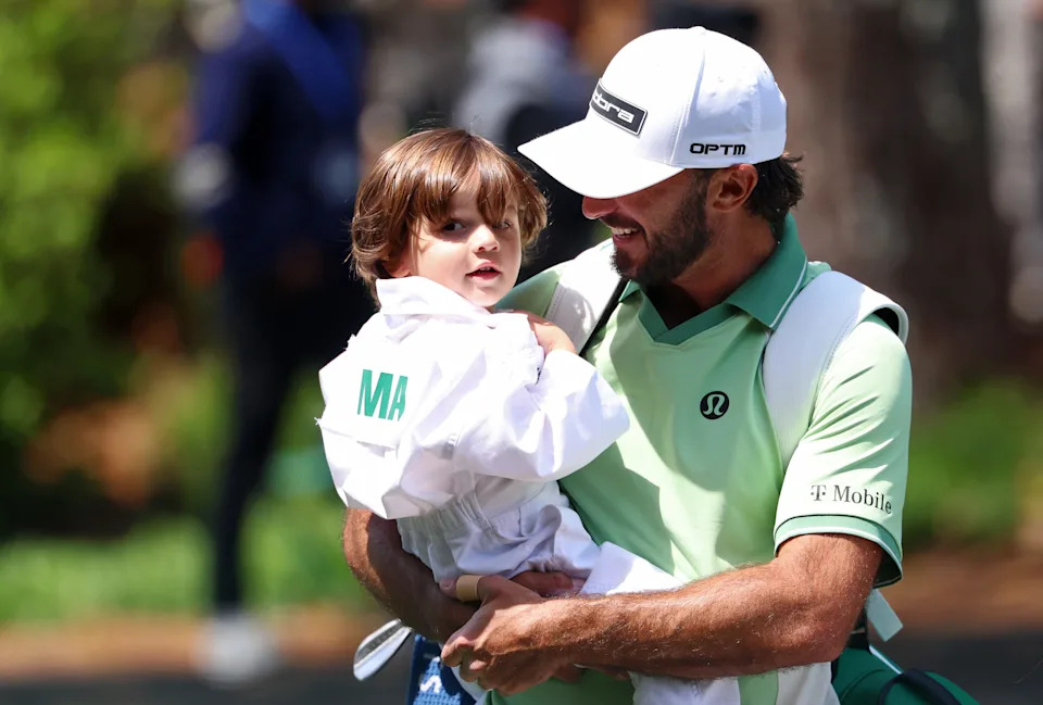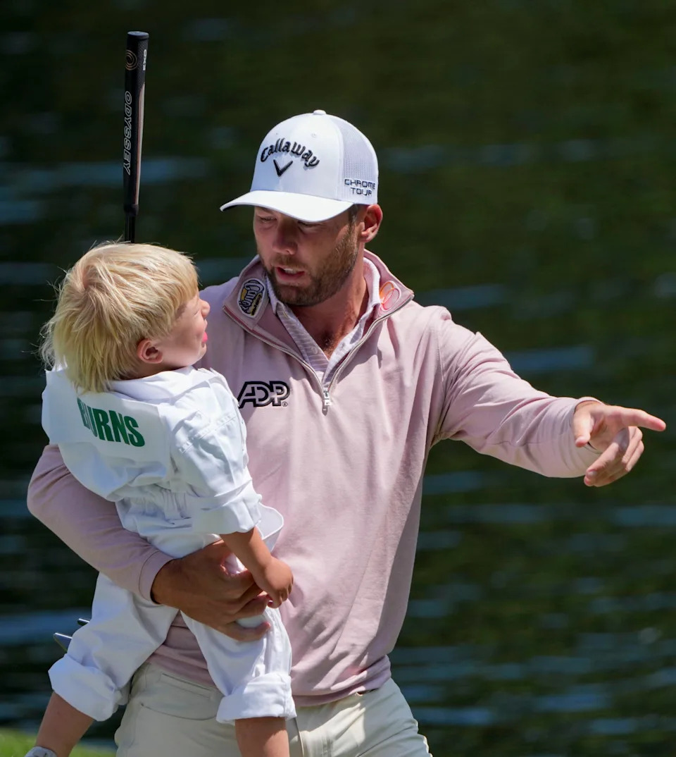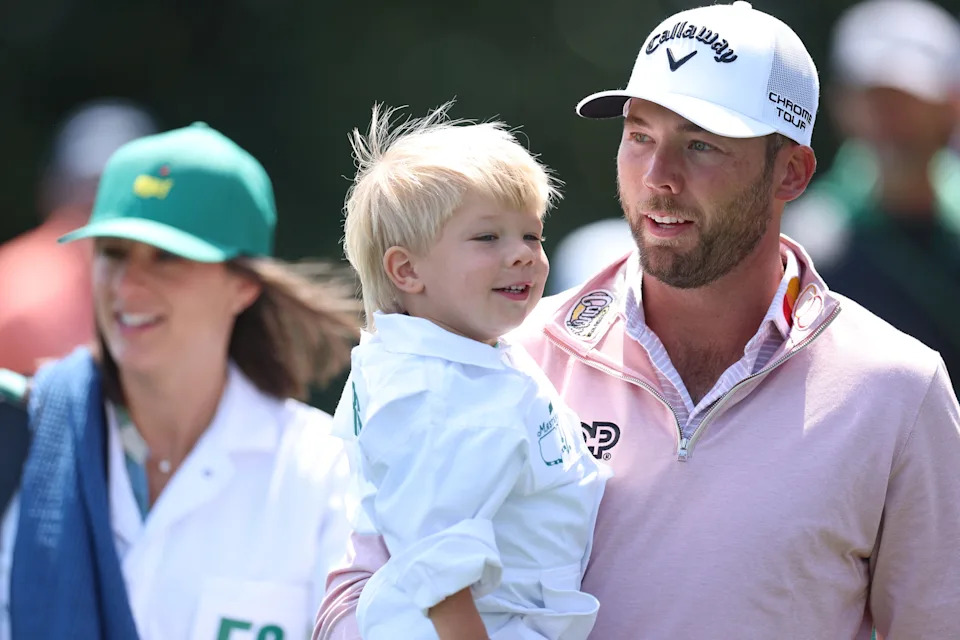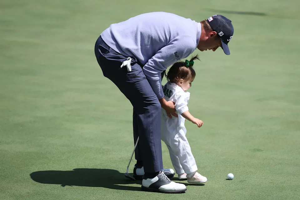 Sam Burns walks the ninth hole with his son, Bear, during the Par 3 Contest at the Masters Tournament at Augusta National Golf Club.