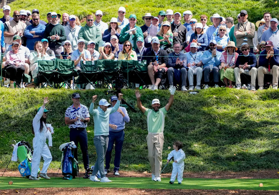 Above, Jordan Spieth and his wife, Annie Verret, crouch down on the ninth green as their son, Sully, crawls across during the Par 3 Contest at the Masters Tournament at Augusta National Golf Club. Spieth’s oldest child, Sammy, clings to his back.
