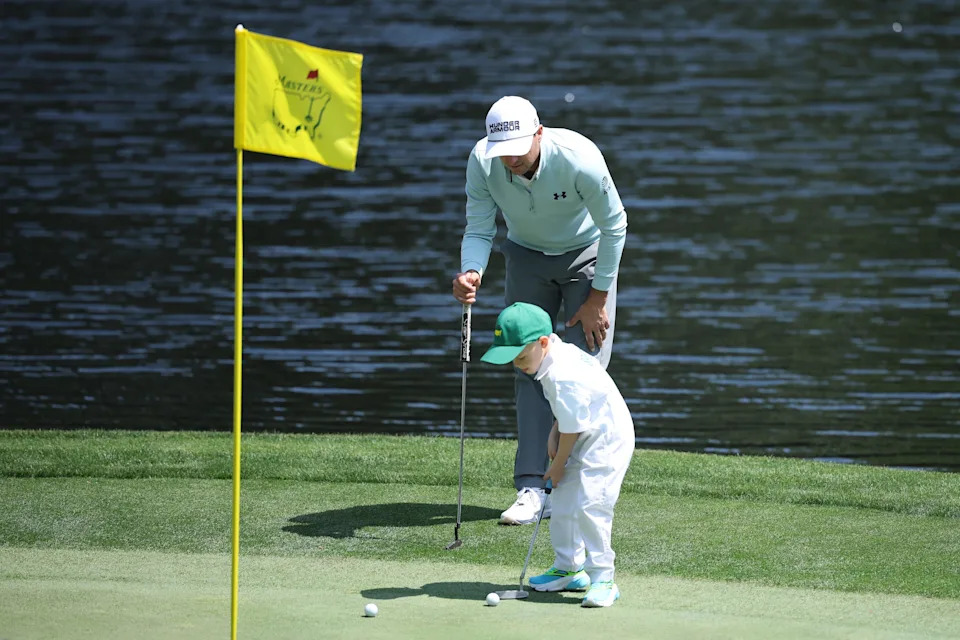 Jordan Spieth of the United States is seen with son Sammy on the ninth green during the Par Three Contest prior to the 2026 Masters Tournament at Augusta National Golf Club on April 08, 2026 in Augusta, Georgia.