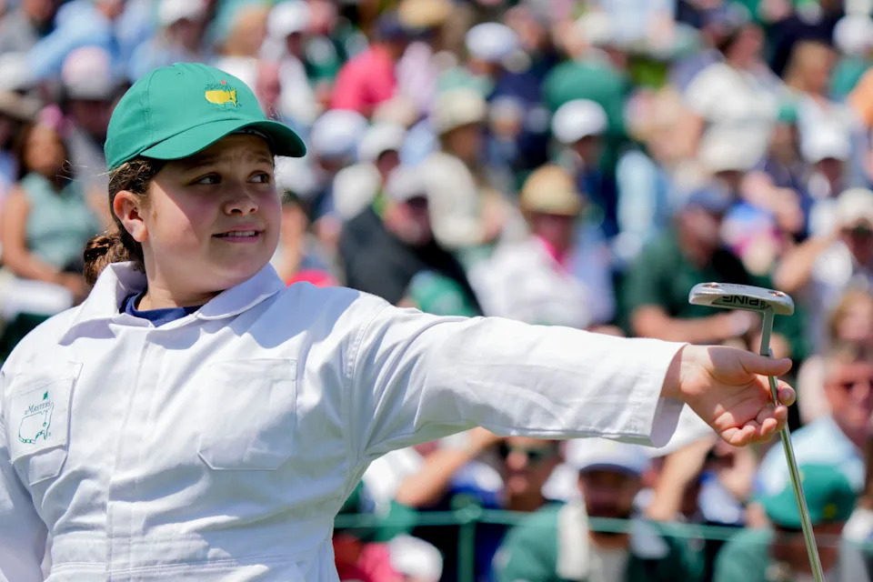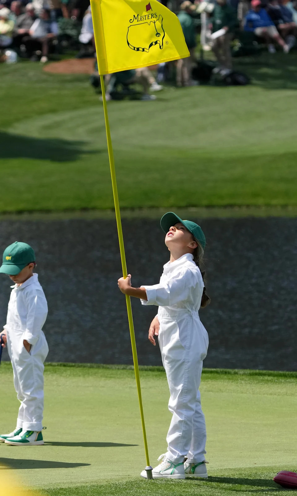Azalea, daughter of Sergio Garcia, holds the flag pin on the fourth green during the Par 3 Contest at the Masters Tournament at Augusta National Golf Club.