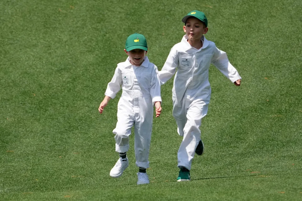 Cooper and Logan Bradley, sons of Keegan Bradley, run on the fourth fairway during the Par 3 Contest at the Masters Tournament at Augusta National Golf Club.