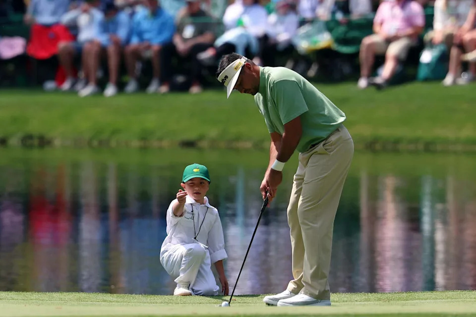 Sergio Garcia and his son Enzo helps line up a putt on the fourth green during the Par 3 Contest at the Masters Tournament at Augusta National Golf Club.