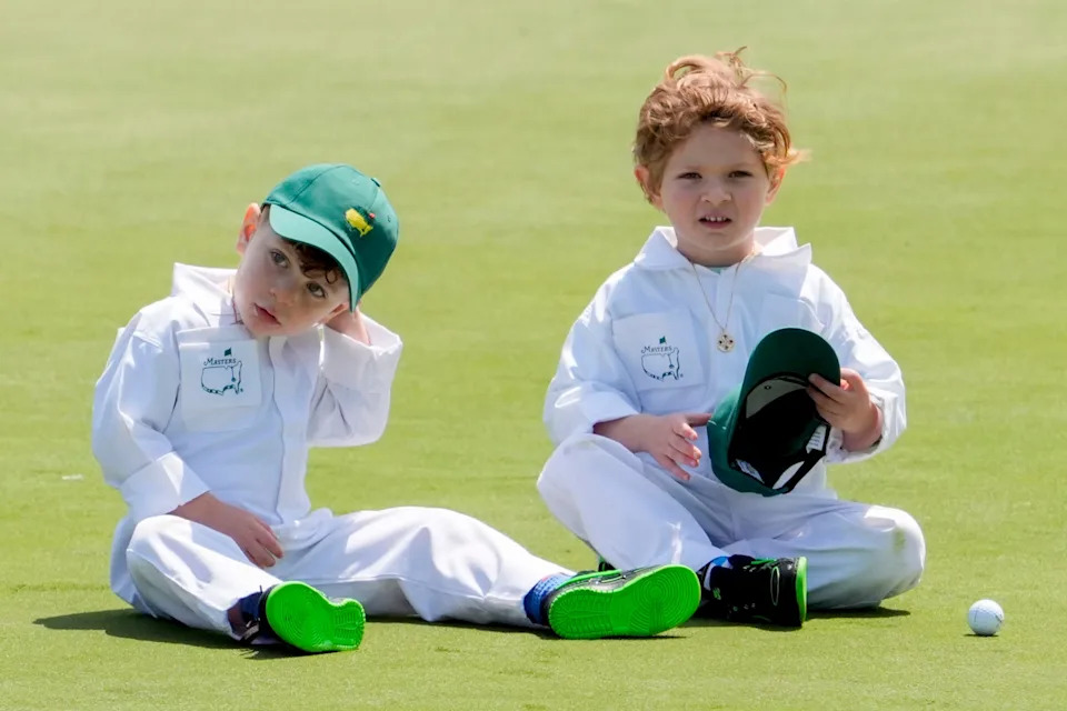 Jon Rahm’s sons, Eneko, and Kepa, sit on the third green during the Par 3 Contest at the Masters Tournament at Augusta National Golf Club.