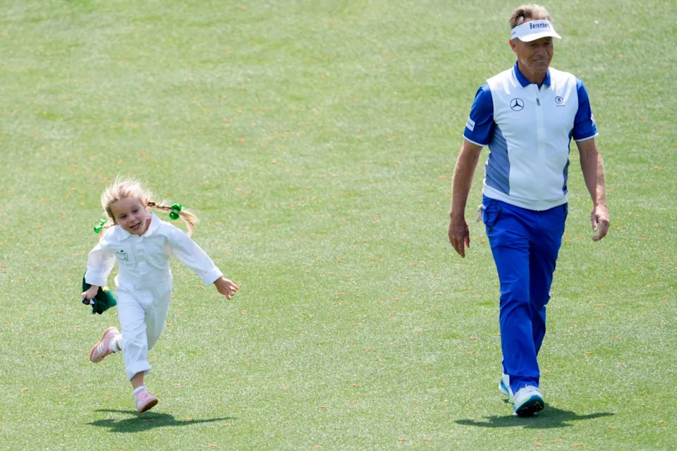 Bernhard Langer and his granddaughter, Stella Rose, move down the second hole during the Par 3 Contest at the Masters Tournament at Augusta National Golf Club.