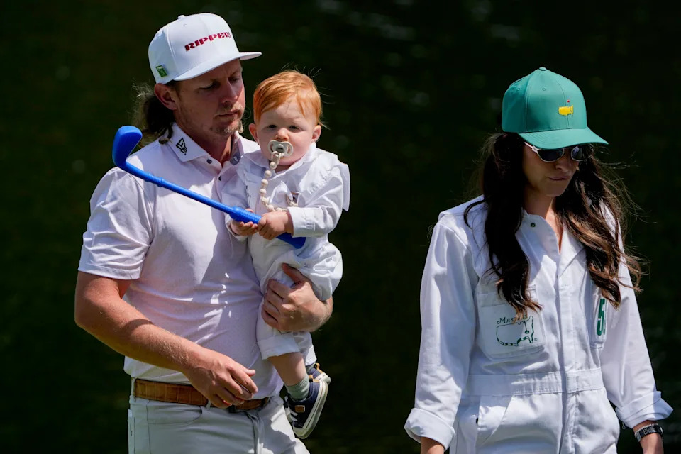 Cameron Smith carries his son, Beaumont, while walking the ninth hole with his wife Shanel Naoum, during the Par 3 Contest at the Masters Tournament at Augusta National Golf Club.