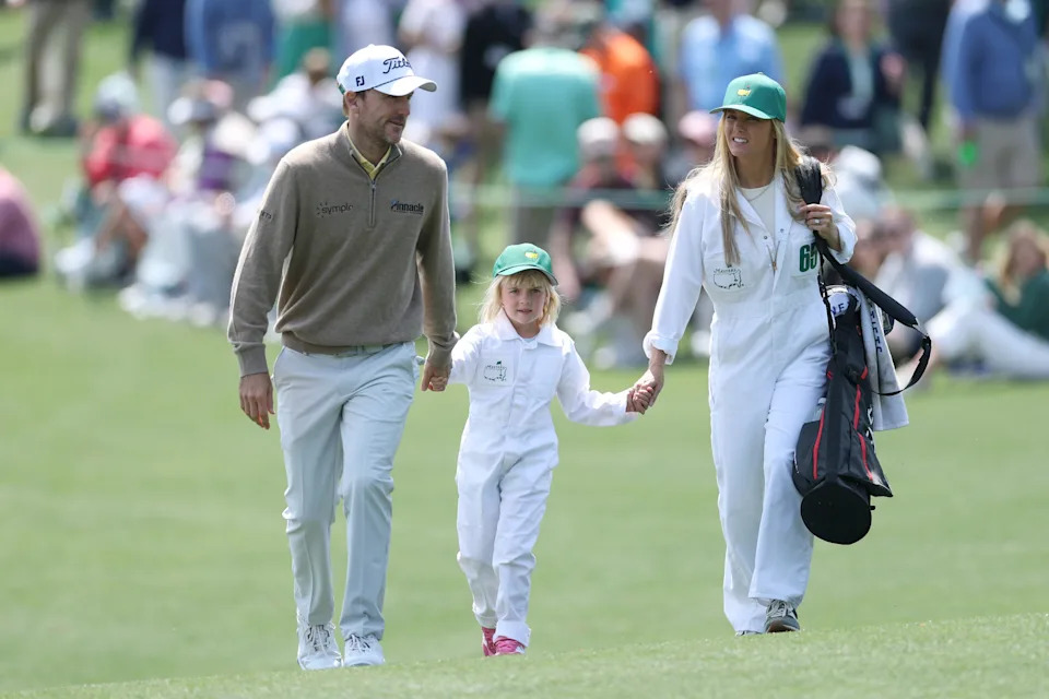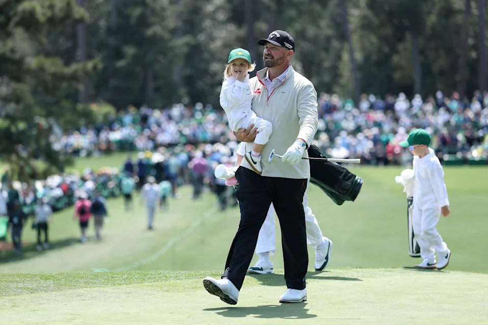 Harry Hall carries his daughter, Lilah, walks on the second hole during the Par 3 Contest at the Masters Tournament at Augusta National Golf Club.