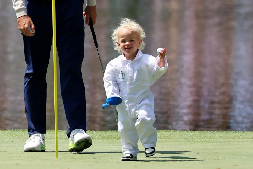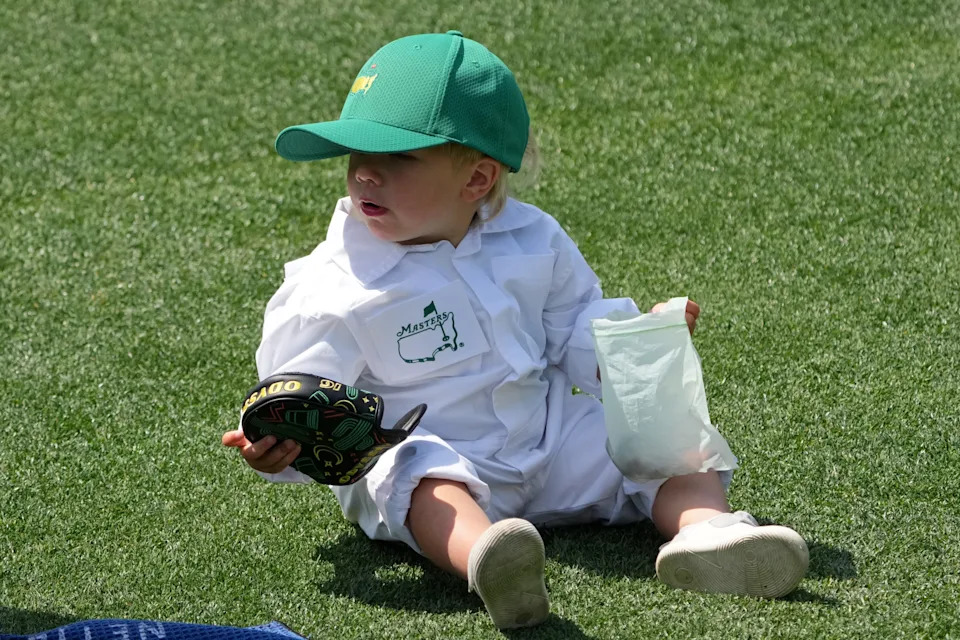 Brandon Holtz’ son, Baker, watches the second green during the Par 3 Contest at the Masters Tournament at Augusta National Golf Club.