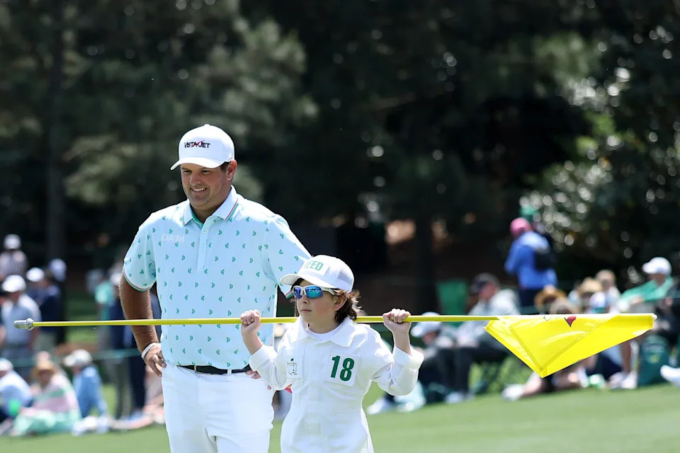 Patrick Reed of the United States and his son Barrett Reed look on from the second green during the Par Three Contest prior to the 2026 Masters Tournament at Augusta National Golf Club on April 08, 2026 in Augusta, Georgia.