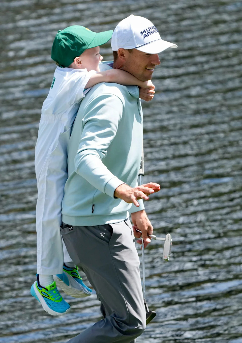Sammy Speith hangs from his father, Jordan Spieth’s back on the ninth green during the Par 3 Contest at the Masters Tournament at Augusta National Golf Club.