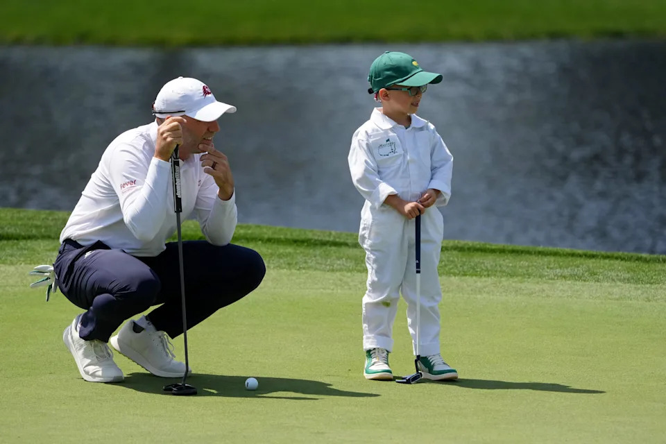 Russell Henley of the United States watches his son Robert putt on the second green during the Par Three Contest prior to the 2026 Masters Tournament at Augusta National Golf Club on April 08, 2026 in Augusta, Georgia.