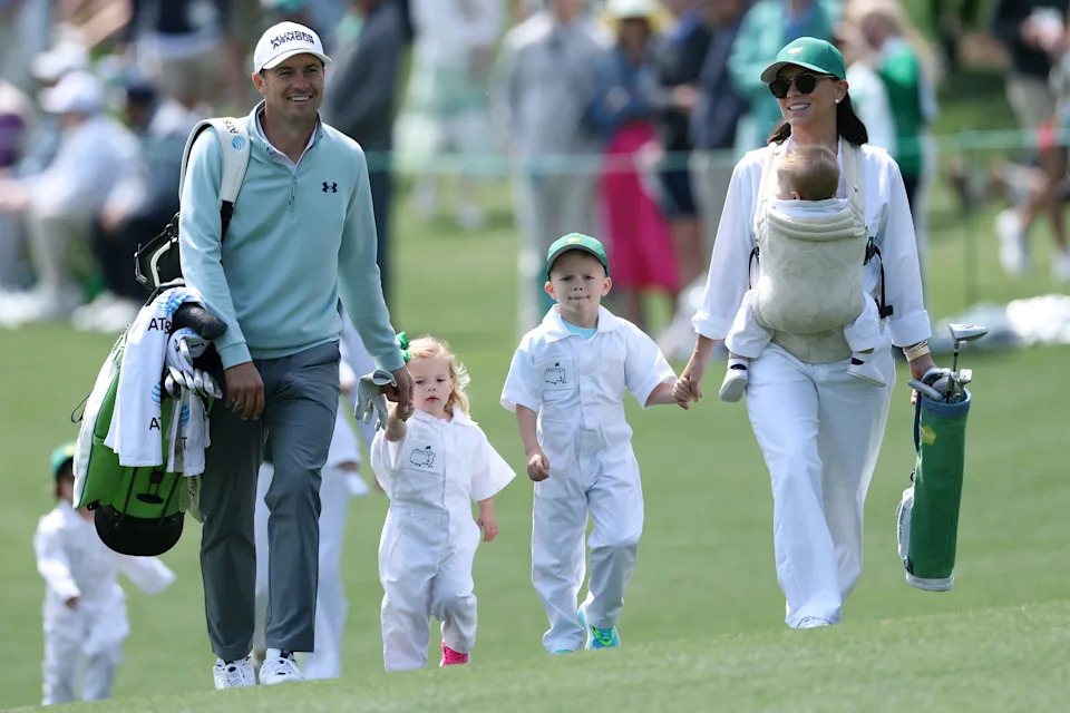 Jordan Spieth (L) of the United States walks with his wife Annie (R), son Sammy (2nd R), daughter Sophie (2nd L) and son Sully (R) during the Par Three Contest prior to the 2026 Masters Tournament at Augusta National Golf Club on April 08, 2026 in Augusta, Georgia.