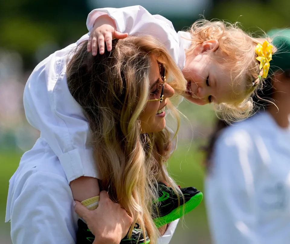 Elizabeth Holtz, wife of Brandon Holtz, holds up their daughter Millie on the fourth green during the Par 3 Contest at the Masters Tournament at Augusta National Golf Club.