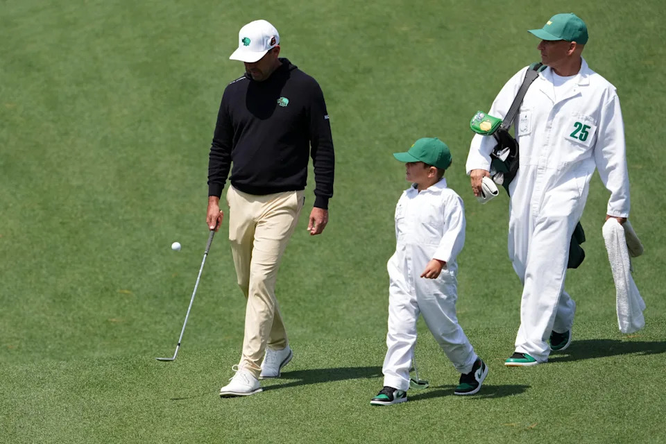 Sergio Garcia’s son, Enzo, plays on the third green during the Par 3 Contest at the Masters Tournament at Augusta National Golf Club.